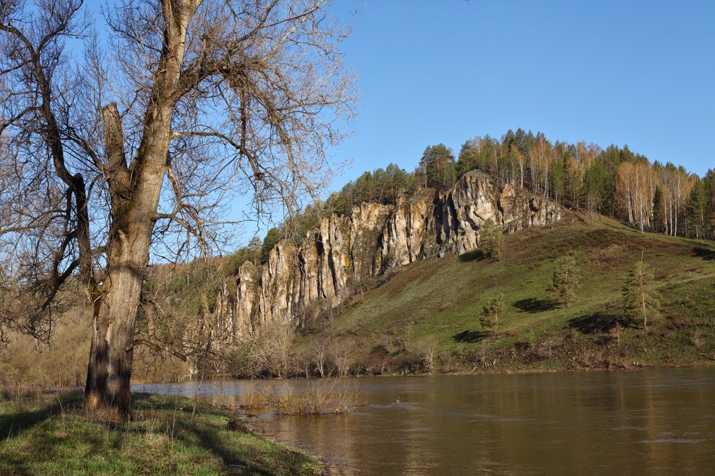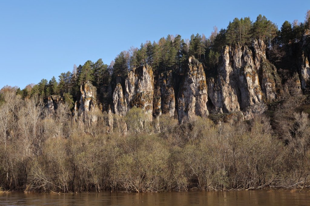 Прогулялся вверх по течению, вдоль Большого Лимоновского гребня. Очень красивое «сооружение», безусловная жемчужина не только маршрута, но и в целом — Урала. Следом за ним сразу начинается скала Жеребчик, с её причудливыми каменными колоннами.