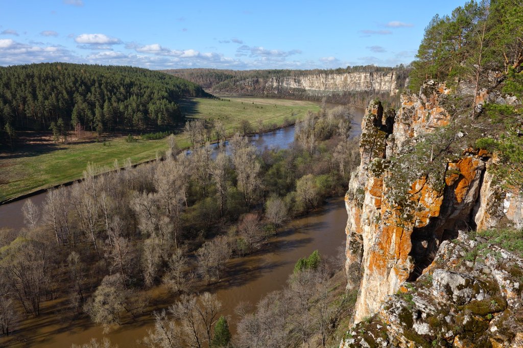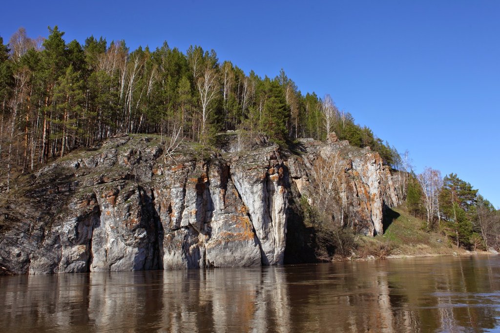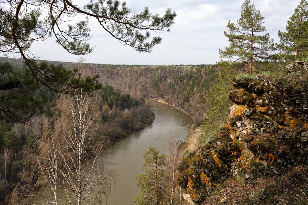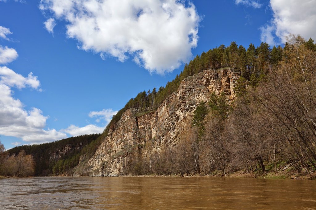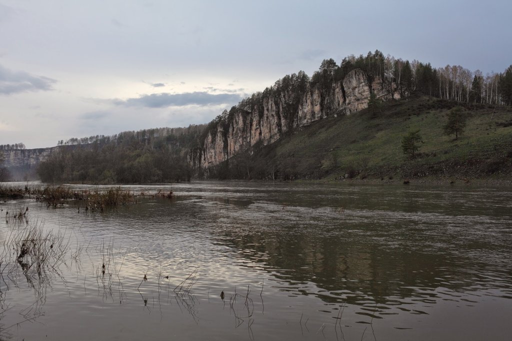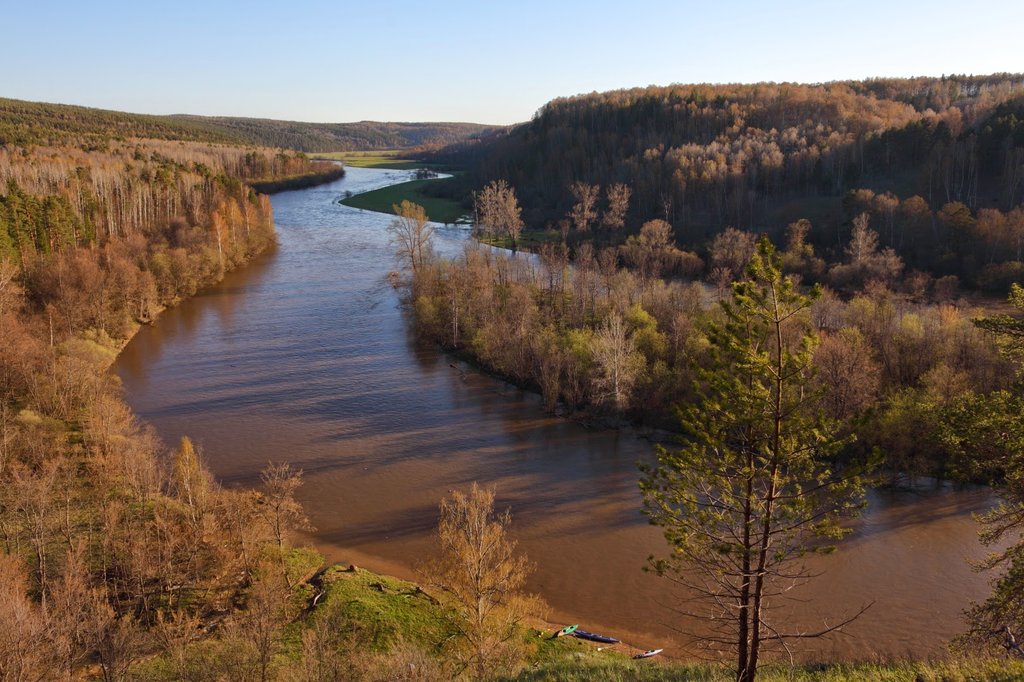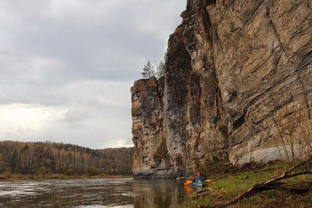 После петли и поворота реки (огибающей здесь хребет Зигальга), течение успокаивается. Остается хорошим (можно не грести), но при этом уже и нельзя назвать здесь реку «горной». Одна из излучин реки прямо очень сильно напомнила Керженец, на который мы часто ходим в весенние походы. Только местами появляются прибрежные скалы, делающие реку похожей на тот Урал, который мы знаем по мотивам походов на Чусовую и Белую…