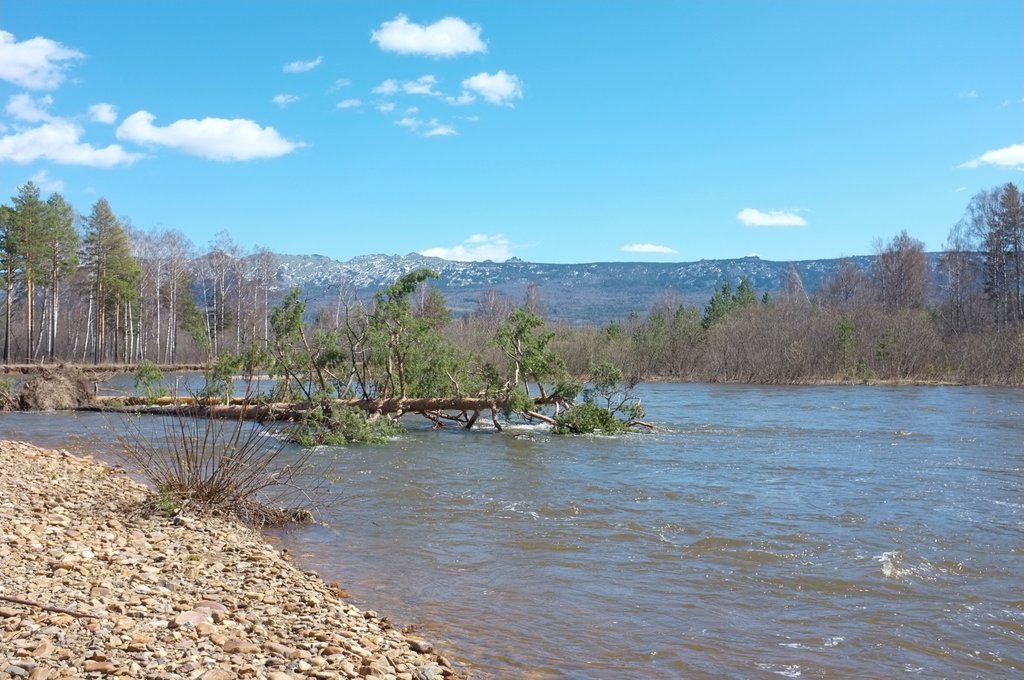 Река продолжает оставаться резвой и весёлой. Перекаты (правда, залитые водой) следуют один за одним. Встретилась пара островных разбоев. И — вот оно — страшное место! Сосна поперек реки! Оказалась она, правда, не такой большой, русло перегораживала только наполовину, и, видимо, могла представлять опасность только для совсем неопытного экипажа катамарана, не справившегося с управлением.
