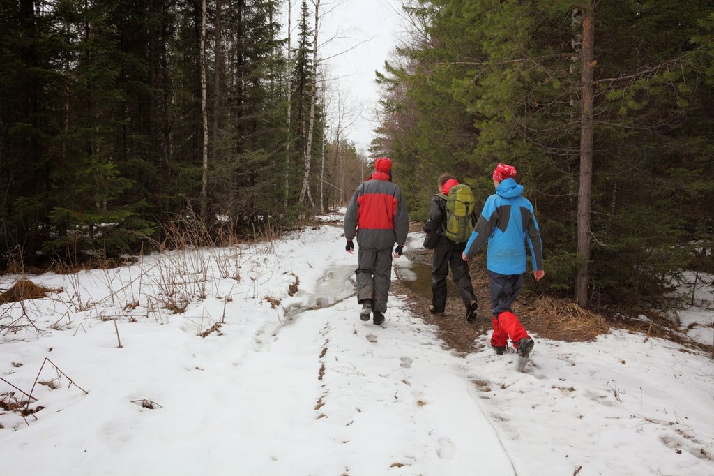 Изначальный план, составленный по результатам анализа карты, предполагал перейти ручей Карагайка и по тропе идти в седловину между Большим и Малым Иремелем. Ему не суждено было сбыться, поскольку сухой переправы через ручей мы не нашли и решили двинуться вдоль левого берега в надежде перейти на другую сторону выше. Но и это сделать не удалось — возможности посуху или с минимальным намоканием перейти ручей не представилось. В результате так и поднимались вдоль Карагайки, а потом вдоль его левого притока по лосиной тропе до пересечения с тропой/дорогой, обходящей гору Жеребчик и Большой Иремель с запада. Некоторое время прошли по дороге, обходя лужи и снег. Чем дальше, тем меньше оставалось участков дороги, не покрытых снегом. Андрею, Ане и Грише, одетых в кеды, становилось уже непросто. Решили разделиться. Мы с Вовой двинулись дальше в попытке забраться повыше, остальные — вниз, до границы снега, ждать покорителей вершин.