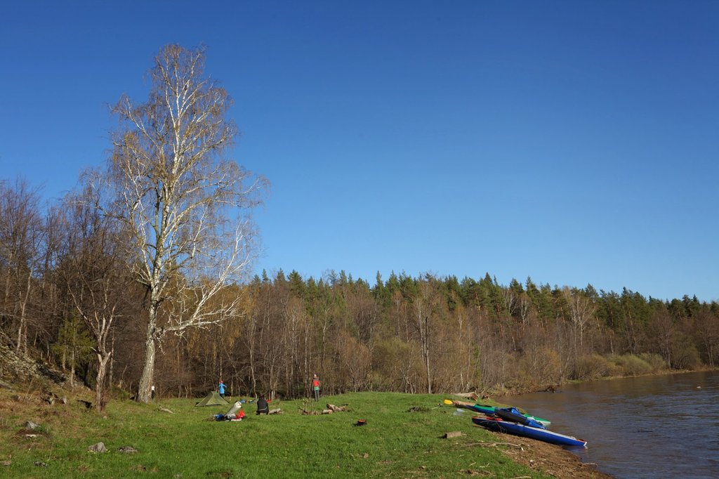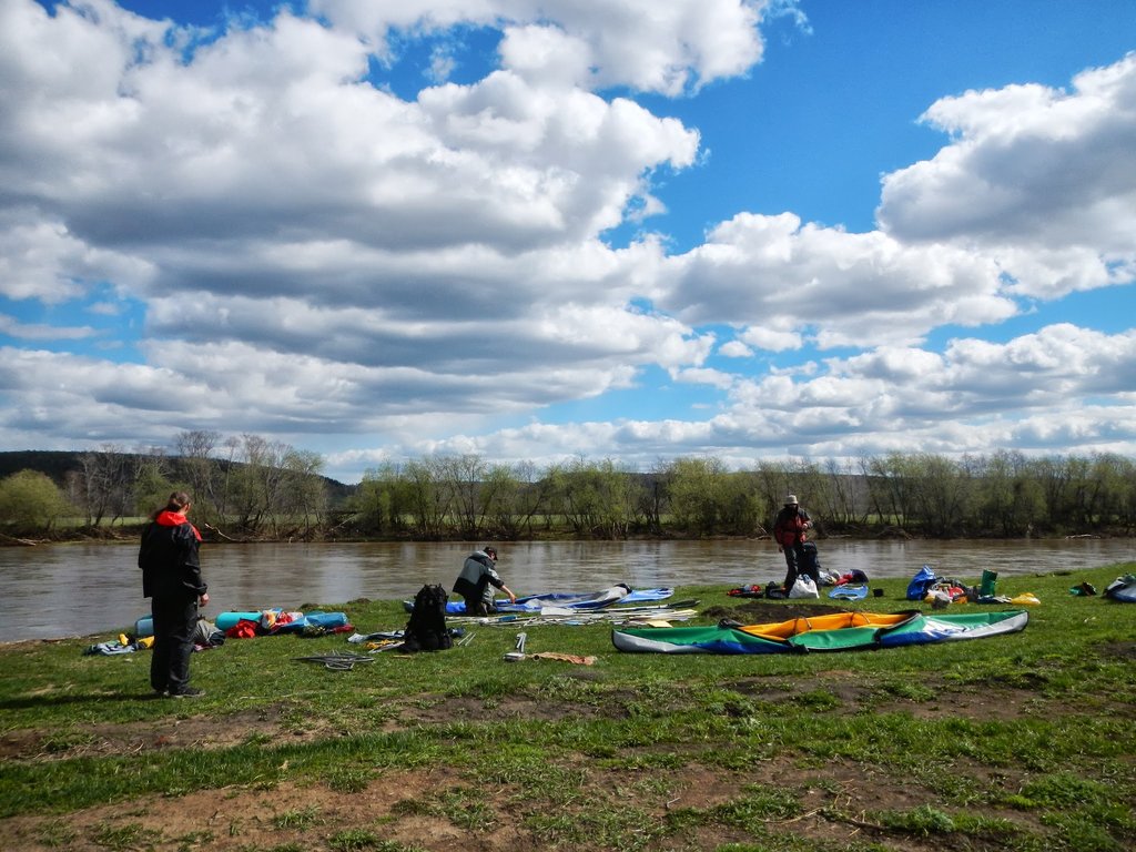 Течение реки довольно сильное, и мы, уже привыкшие к отсутствию стоянок, чуть не проскочили стоянку у Кондрашевского ключа. Место тут, хоть и открытое, но очень удачное — уже одно то, что рядом есть вкусная и чистая вода, дает +100 к баллам стоянки. А вообще — виды отличные, можно слазить на горку, откуда они ещё лучше — что можно желать ещё туристу типа нас?