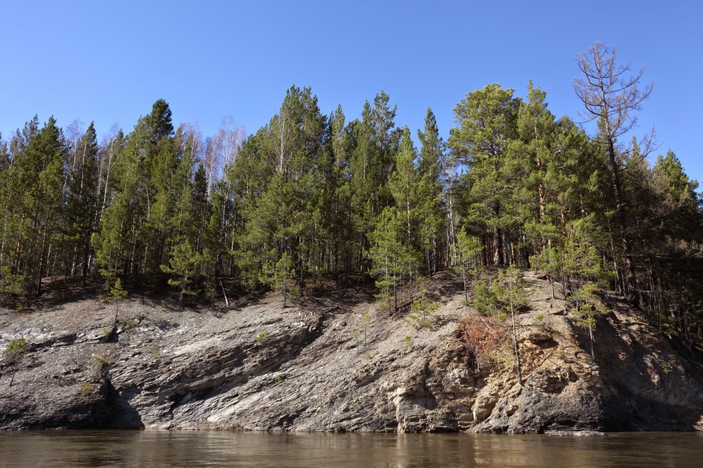 Попытались встать на стоянку на правом берегу — но место понравилось не всем. Пошли дальше, прошли поворот реки возле горки с забавным названием Фронькина Шишка и встали на не очень высоком обрывистом правом берегу. Место ровное, сосны. Вдоль реки идет небольшая колея — явно сюда приезжают по выходным из ближайших городков — Трёхгорного и других. Но сегодня тут тихо и хорошо.
