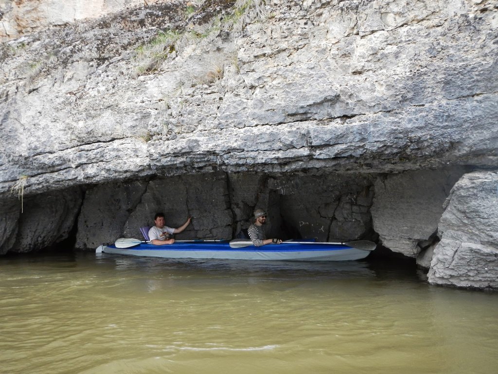 Обогнули излучину урочища Жеребчик. Сразу после неё остановились на левом берегу, чтобы совершить экскурсию в две пещеры (Голубиная и вторая, название которой не помню). Вход во вторую (ниже по течению) не нашли, но зато за пару подходов нашли первую, которая оказалась большой и интересной внутри. Андрей с Аней в пещеры не лазили, загорали на берегу, а остальные оторвались, как могли.