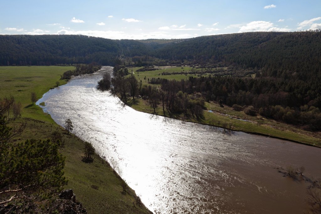 С середины подъёма на скалу становится хорошо видна излучина реки ниже по течению и урочище Жеребчик, которое она огибает. Урочище представляет собой большое, поросшее зелёной травкой, ровное поле, на котором проглядывает вереница из нескольких курганов, оставленных прежними жителями этих мест. Интересно, чьи эти курганы?