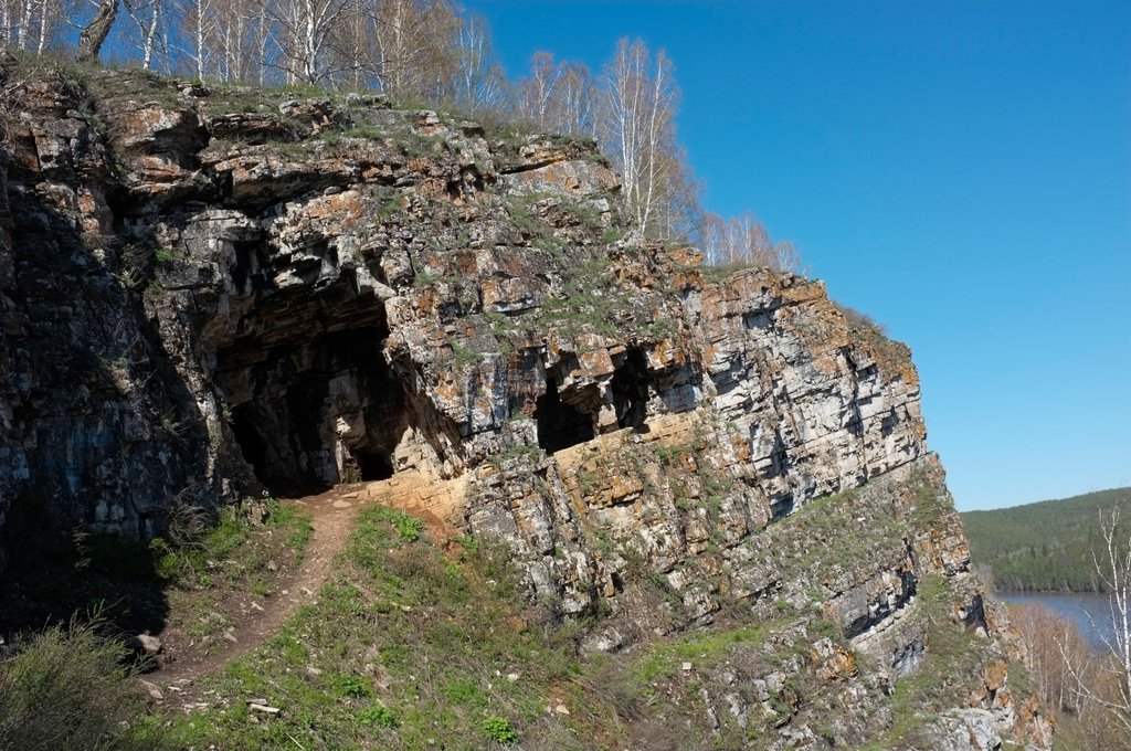 Ещё чуть ниже остановились на левом берегу под Бурановской пещерой. Эта пещера находится высоко по склону. Фотографировались на «столбах» возле входа в пещеру, а потом пережидали неожиданно налетевший дождь.