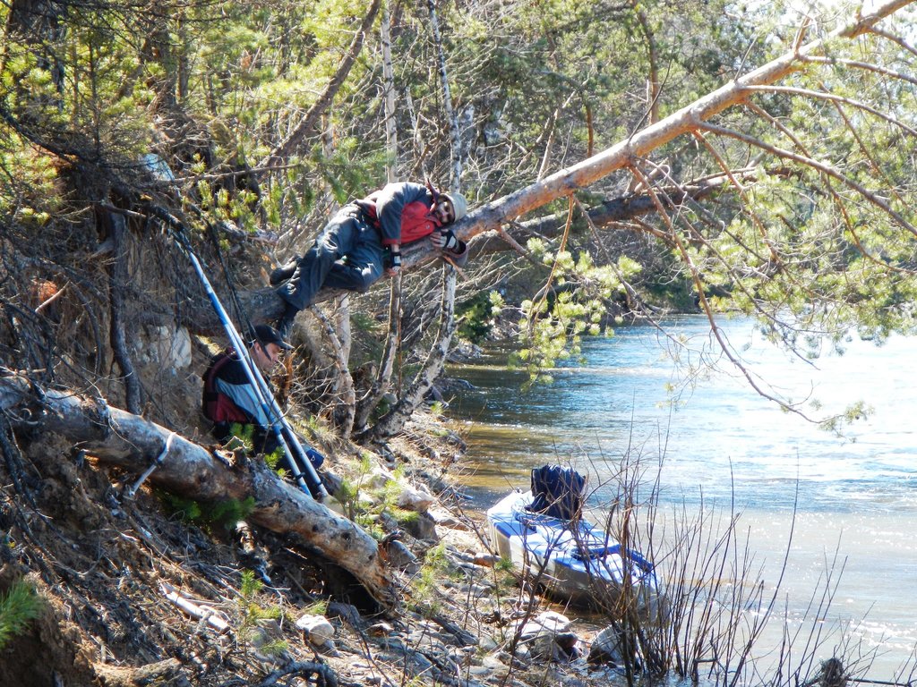 Перед сосной мы встретили вчерашних ребят на плоту из покрышек. Управляемость у их посудины очень плохая, поэтому обойти сосну практически невозможно с наплыва. Они решили обноситься по берегу и тут наша помощь оказалась очень кстати — плот совсем не легкий. Для нас же это было очередным приятным приключением и развлечением.