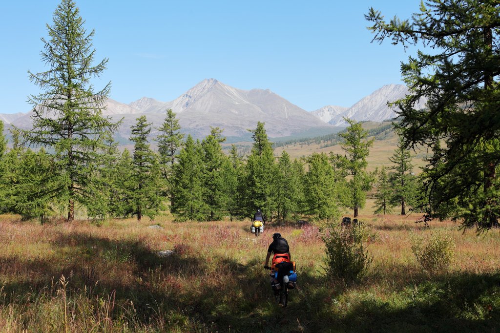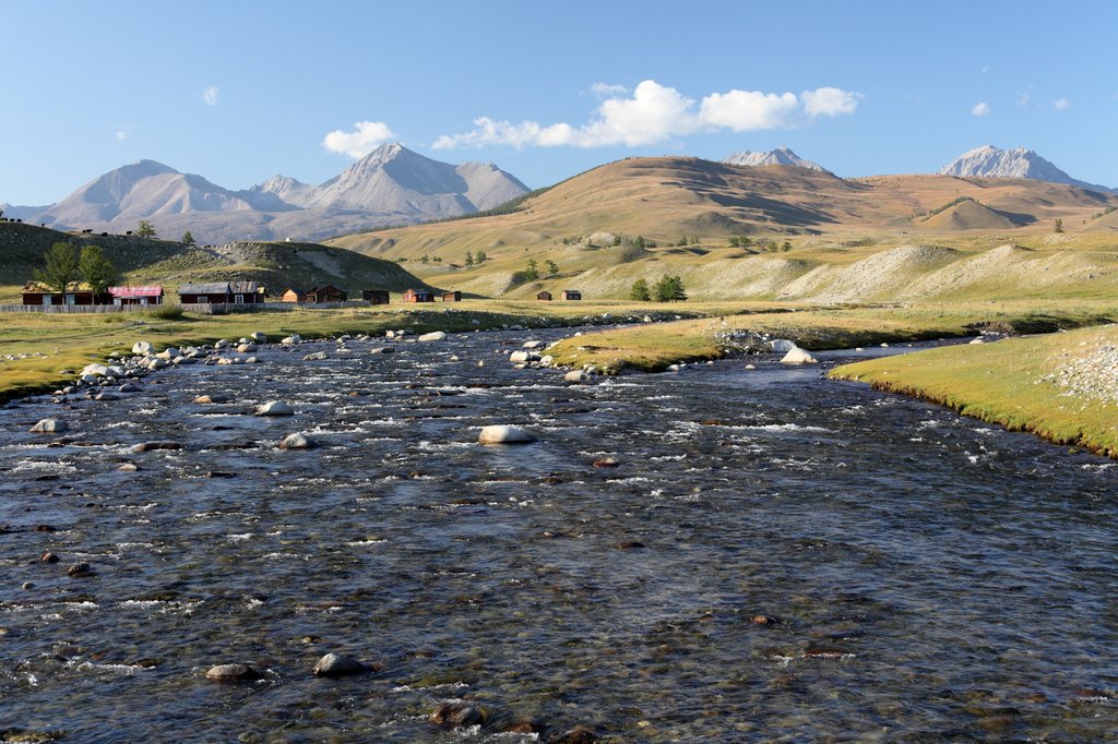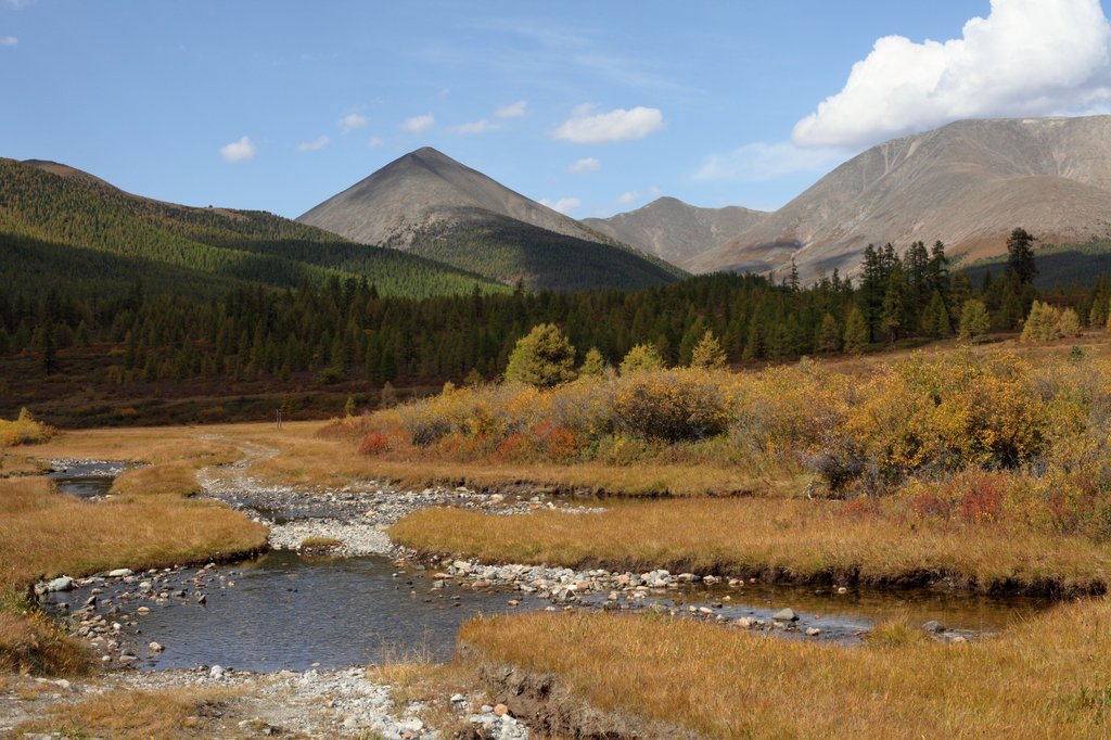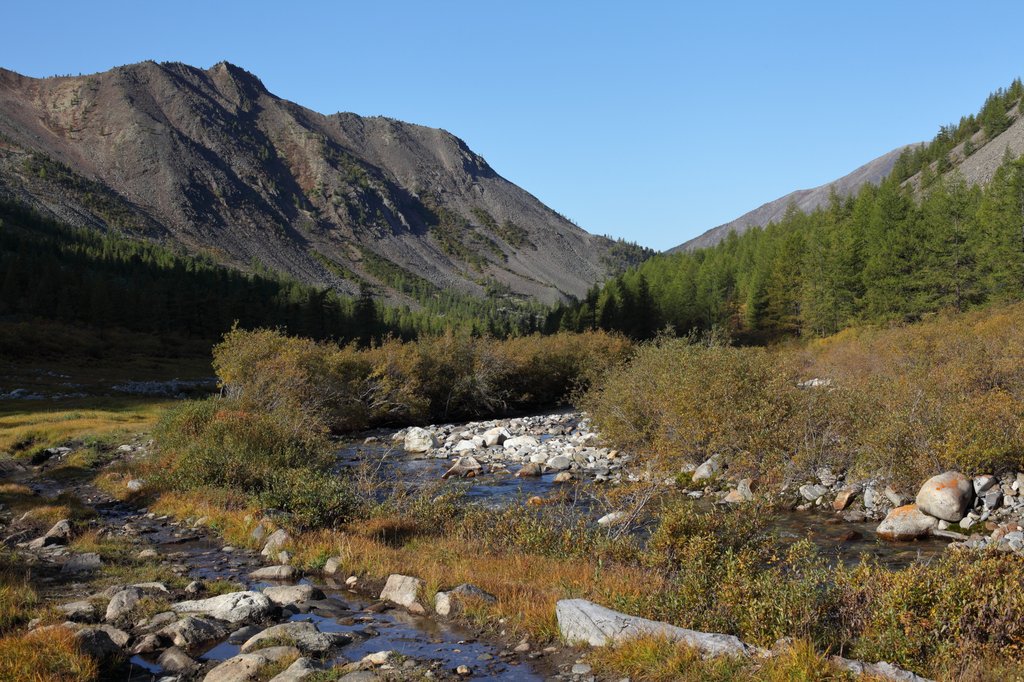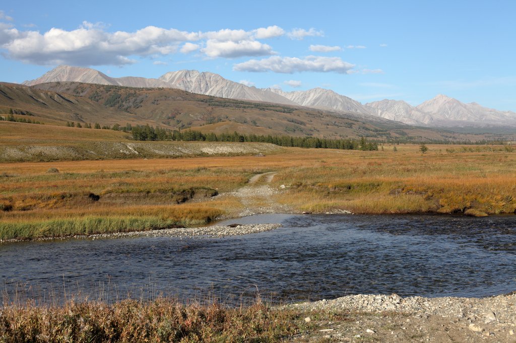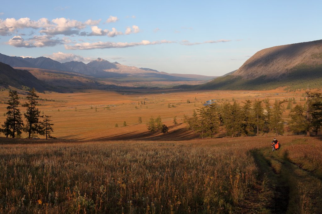 Саньжа сказал: "Хорошая примета - начинать путешествие в такую погоду". И правда, когда светит солнце, освещая далёкие горы на фоне голубого неба, то нет никаких сомнений в необходимости предстоящего пути, какие бы сложности ни ожидали впереди. Мы весело проехали посёлок и начали подниматься по долине ручья вверх, по направлению к перевалу Хавцалын.