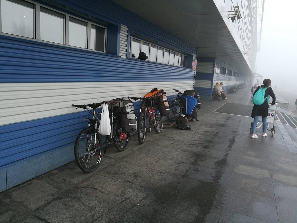 В этот раз получили велосипеды без приключений, вышли на улицу из аэропорта и стали собираться у стеночки. Туман стал совсем плотным.