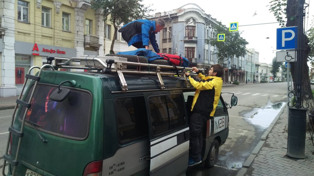 Водитель Николай приехал точно, как договаривались, ко входу магазина, и мы начали погрузку. Лёхин велосипед, как самый большой, укрепили на крыше, а наши с Максимом поместились, со снятыми колесами, за последним рядом сидений. Рюкзаки и многочисленные пакеты из магазина пошли внутрь и там даже осталось немного места для пассажиров. Чуть не забыли моё колесо, спрятавшееся за лавочкой.