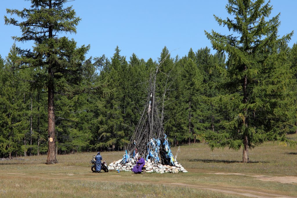 Перевал отмечен традиционной конструкцией из камней и сухих стволов деревьев, "обо́". Некоторые камни, лежащие в основании, большого размера и кто-то хорошо потрудился, чтобы притащить их сюда. Рядом с обо стоит скамеечка. Проезжающий монгол обязательно останавливается, некоторые обходят вокруг обо (вроде как по традиции следует обходить три раза по часовой стрелке), брызгает водой, молоком или водкой, сидит на скамеечке.