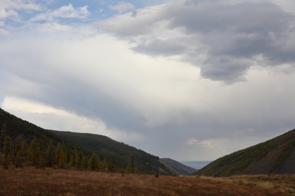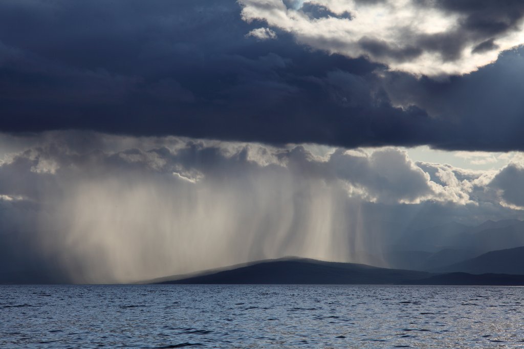 Мне особо долго поспать не пришлось, поскольку ожидалось решение вопроса с пограничниками, поэтому минут через 40 я пошёл бродить по территории базы. Как раз в это время на западной стороне Хубсугула шёл дождь и были красивые облака...