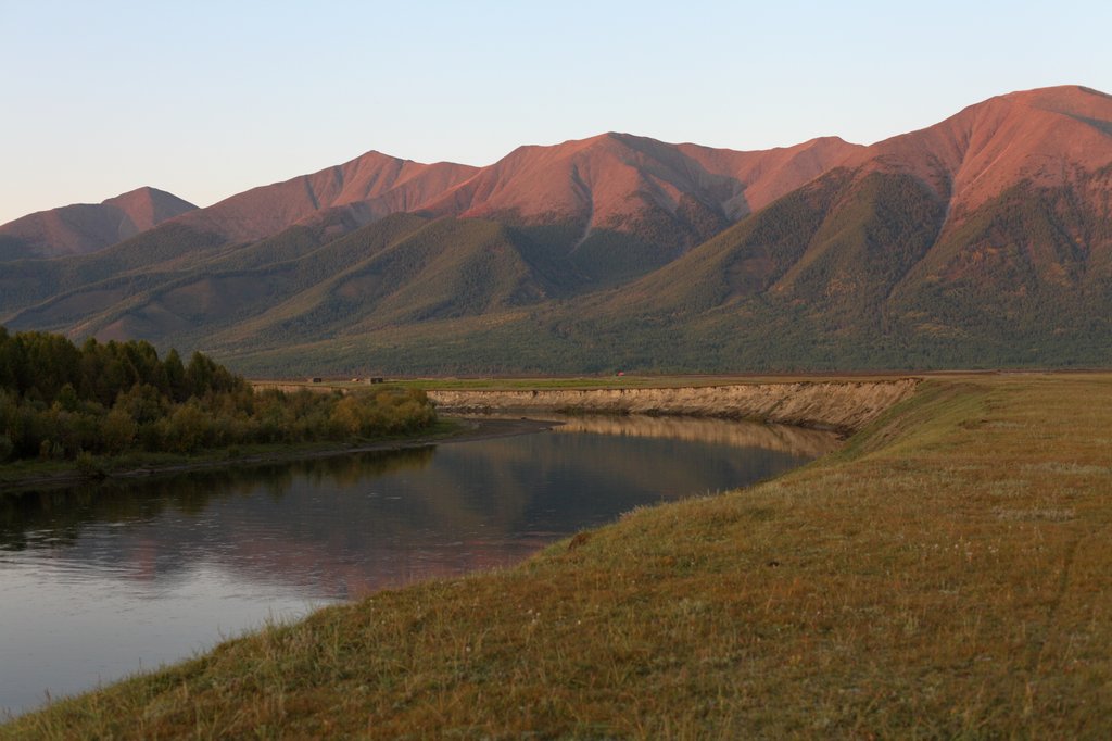 К закату приехали на красивое место - долину реки Их-Лалбайн, между перевалами Борсогийн и Овоотын. Наверное, это лучший из видов, которые есть на дороге их Хатгала в Ханх - на озеро, на остров Далай-Модон-Хуйс, на знакомый нам перевал Жиглегийн на другом берегу...