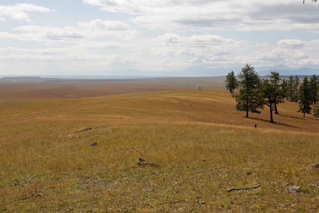 Подъехали к перевалу Хаагдагийн-шил. Здесь красивое место с большими лиственницами. Захотелось посмотреть с холма - и не зря - с него открывается красивый вид на окрестную степь и далекий ещё Хубсугул. На Ханх с запада надвигалась гроза.