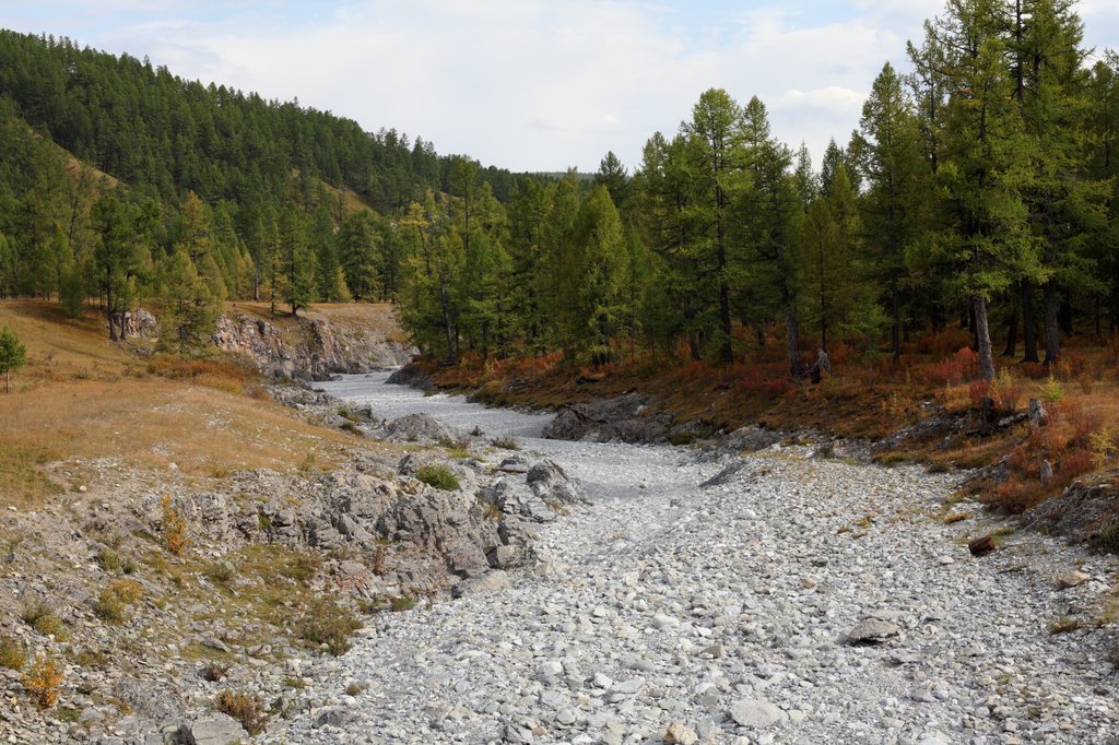 Саньжа сказал: "Хорошая примета - начинать путешествие в такую погоду". И правда, когда светит солнце, освещая далёкие горы на фоне голубого неба, то нет никаких сомнений в необходимости предстоящего пути, какие бы сложности ни ожидали впереди. Мы весело проехали посёлок и начали подниматься по долине ручья вверх, по направлению к перевалу Хавцалын.