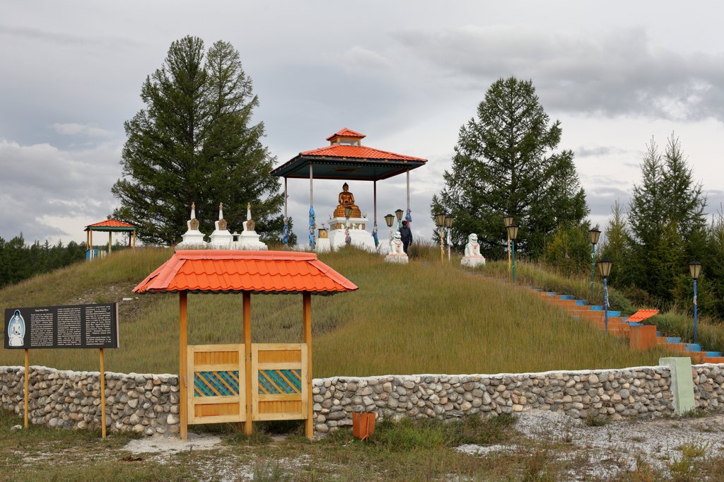 Сразу после выезда, по левую руку, на небольшом холмике, находится статуя Будды с тремя ступами. Холмик окружен невысокой каменной стеной с красивыми деревянными воротами. Рядом буйно растет облепиха, вся покрытая вкусными ягодами. Лёша оторвал пару веток.