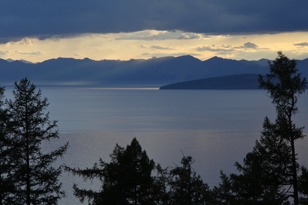 Мне особо долго поспать не пришлось, поскольку ожидалось решение вопроса с пограничниками, поэтому минут через 40 я пошёл бродить по территории базы. Как раз в это время на западной стороне Хубсугула шёл дождь и были красивые облака...